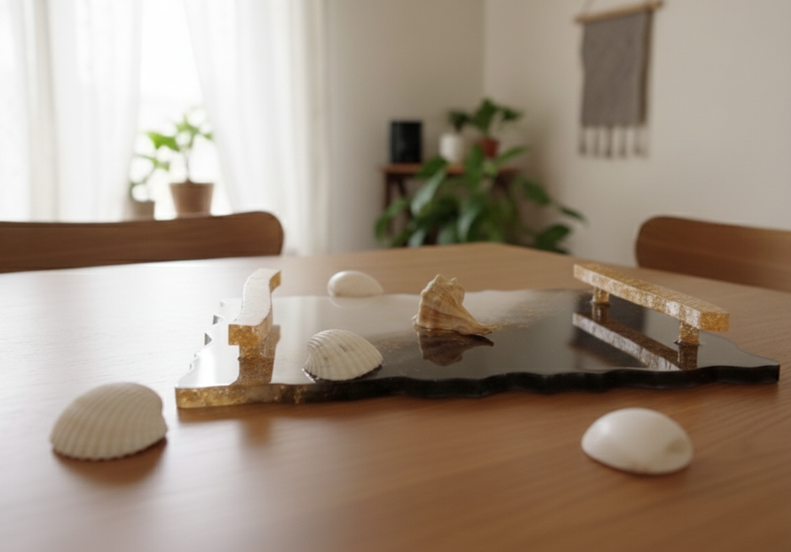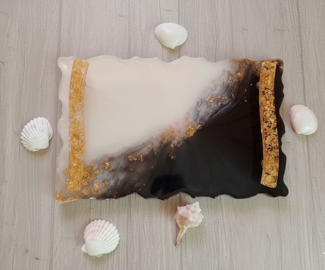 Esta bandeja esta hecha con resina epoxi en 3 colores diferentes: negro, blanco y con detalle dorado.