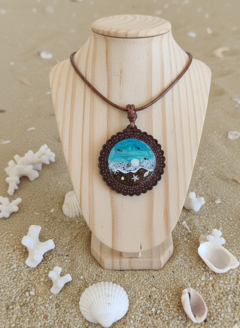 Sumérgete en la magia del mar con nuestro exclusivo collar de madera y resina estilo Marina hecho a mano, una pieza de joyería artesanal que captura la esencia de la costa. Cada colgante es una ventana tridimensional al océano, donde la calidez de la madera natural se encuentra con la transparencia cristalina de la resina epoxi. En su interior, hemos dispuesto conchas marinas recogidas a mano, arena fina y toques azules que simulan las olas, creando un auténtico colgante del mar único e irrepetible.