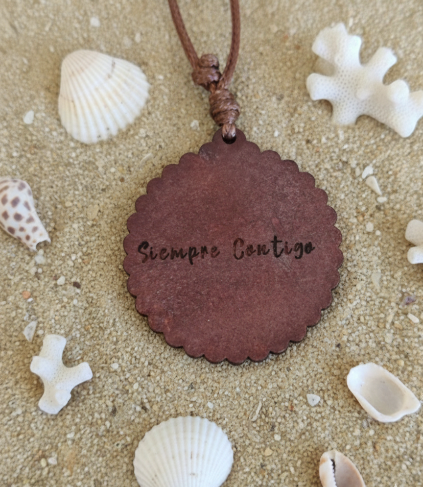 Lo que realmente hace especial a este colgante es su reverso. La parte de atrás, suavemente pulida en madera, está diseñada para ser completamente personalizable. Puedes grabar un nombre, una fecha especial o una dedicatoria significativa, convirtiéndolo en un regalo inolvidable y exclusivo. Esta opción de collar grabado le añade un valor sentimental inigualable, elevándolo de accesorio a tesoro familiar o recuerdo de amistad.