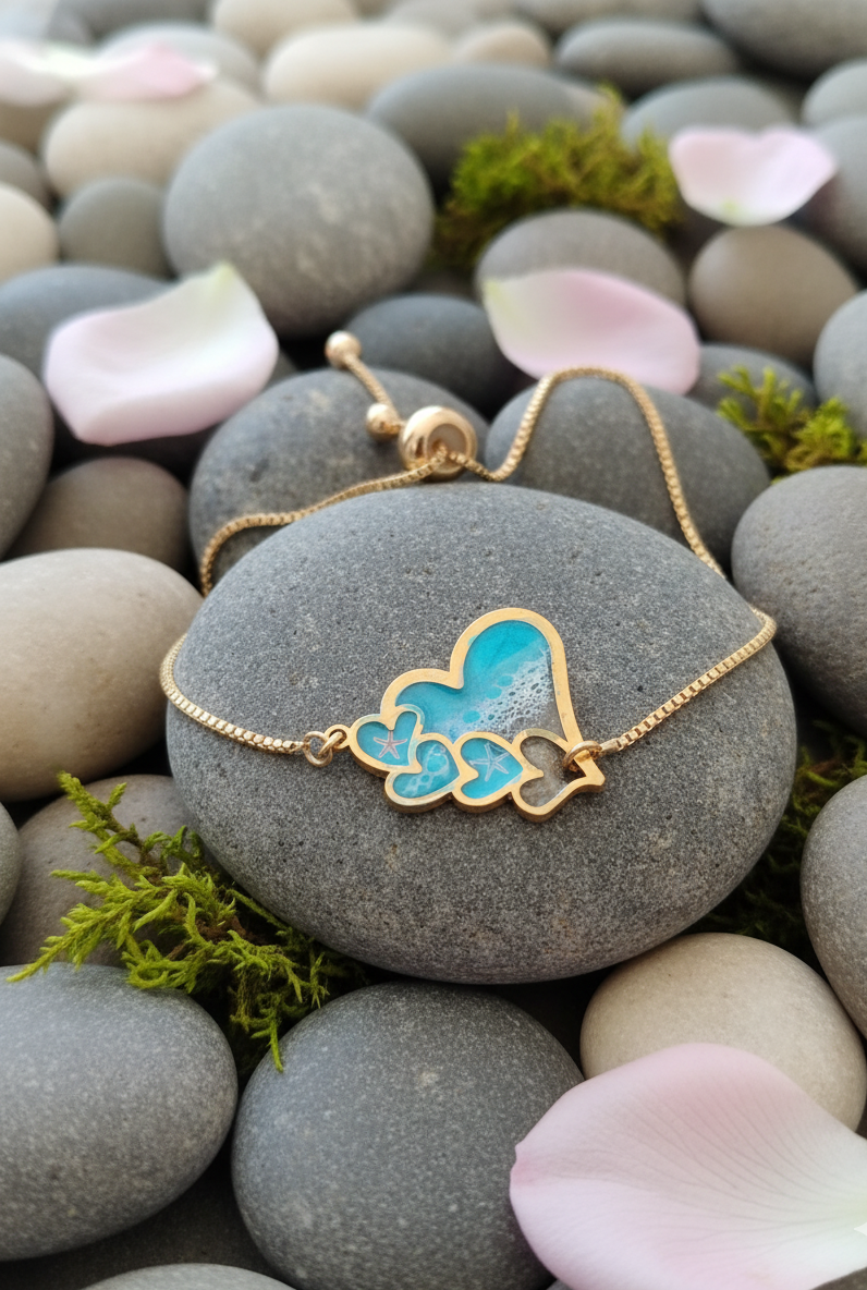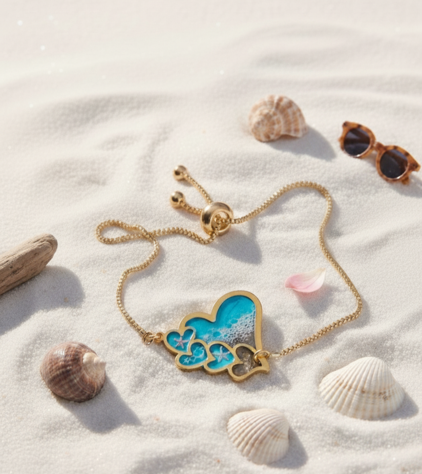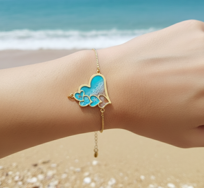 Captura la esencia tranquila y vibrante del océano con nuestra encantadora pulsera de corazones de resina con motivos marinos, una pieza de joyería artesanal que combina ternura y la frescura del mar. Si buscas una pulsera original y con un toque sentimental que te recuerde a la playa, esta joya es la elección perfecta.