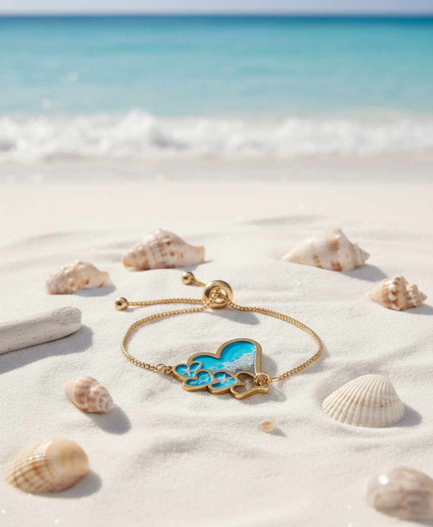 Cada corazón en la pulsera alberga una mini-escena marina: diminutas conchas marinas, arena fina, y pigmentos azules y turquesas que imitan el movimiento de las olas. La transparencia cristalina de la resina de alta calidad magnifica estos detalles, haciendo que cada corazón sea una pequeña ventana al mar. Es la forma ideal de llevar contigo un recuerdo de tus vacaciones o tu amor por el mundo marino, ya que la pulsera con motivos marinos es ligera y cómoda para el uso diario.